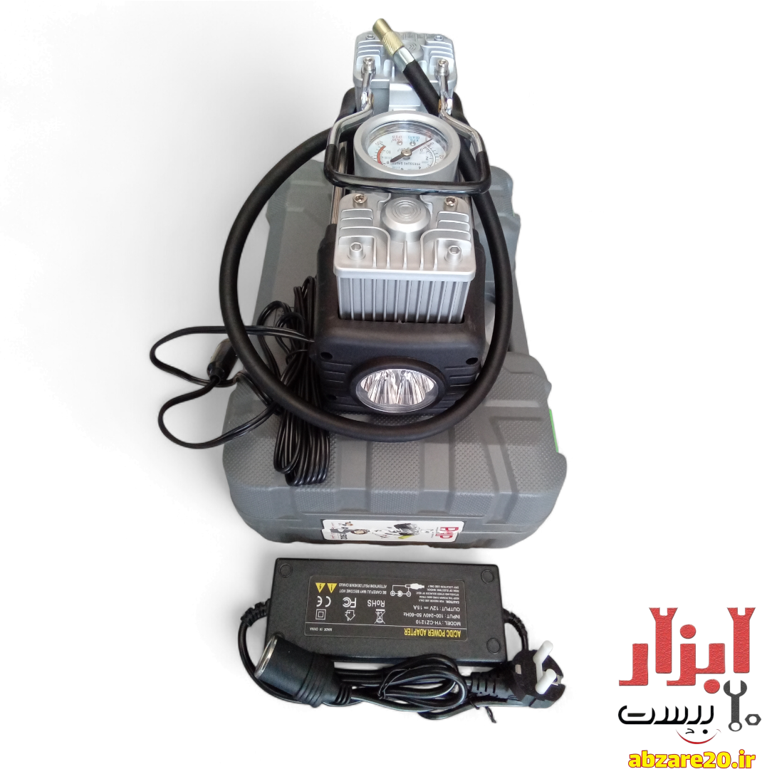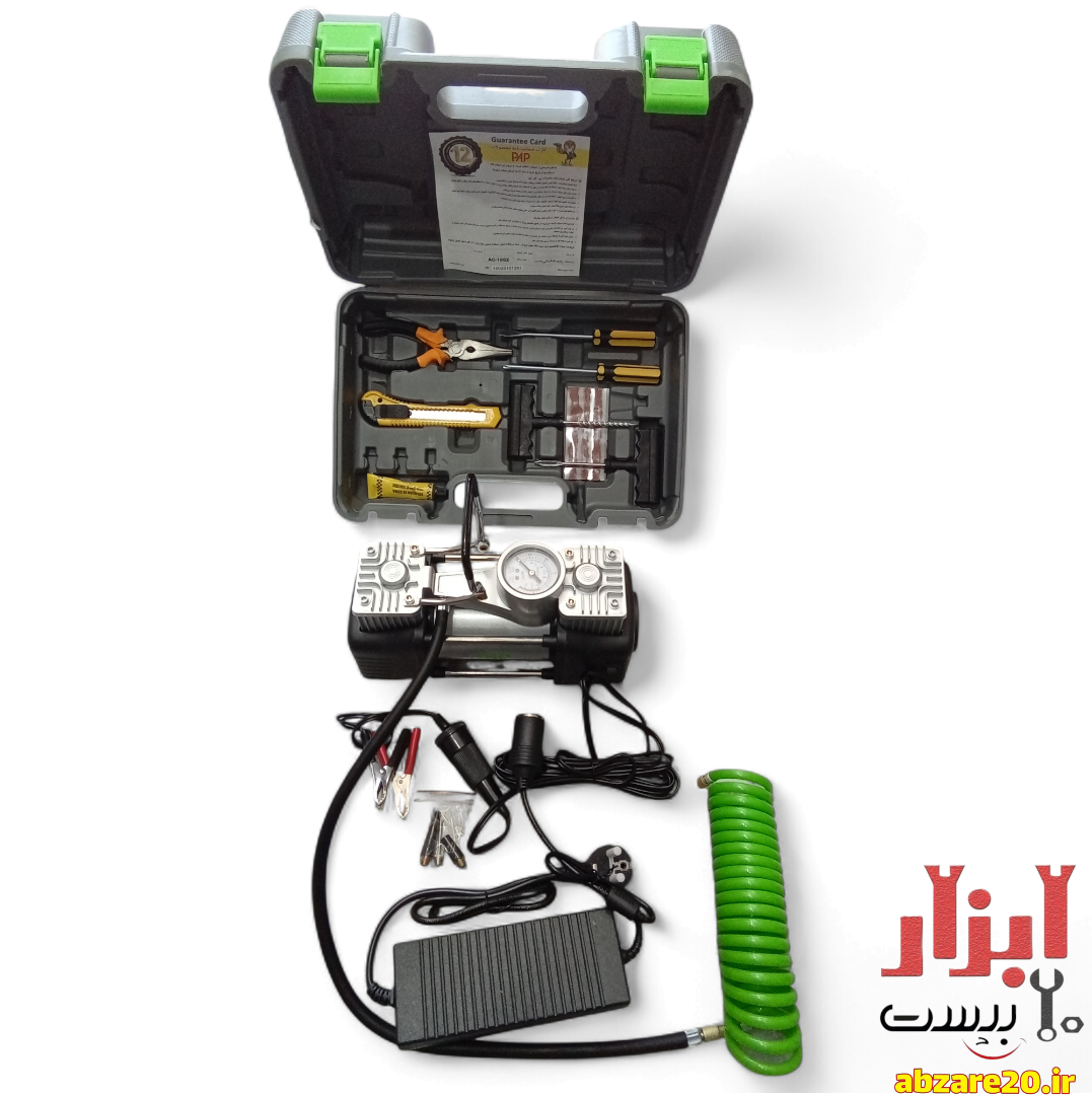 متعلقات: آداپتور اتصال برق شهری، لوازم پنچرگیری، شلنگ فنری 5 متری+3 عدد سری نازل باد